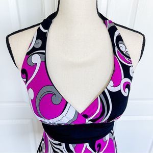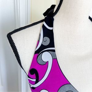Fun, bold, and colorful dress in purple, black, and white swirl design with tie neck, back, and waist.