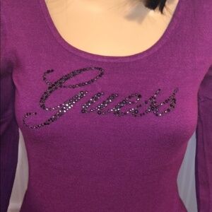 Super cute purple guess sweater. Size Medium. Bling is missing a few rhinestones, but you cannot tell. There is a small stain on the right sleeve. Still has tons of life left.