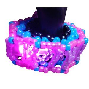 This unisex Purple Blue Kandi Carousel Cuff by The Kandi Bazaar is strikingly vibrant. Crafted from Pony Beads, it showcases glow-in-dark properties and an illuminating light for an enchanting effect.