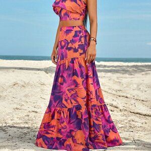 Purple Boho Women's Ruched Side Twist Bandeau Top And Split Thigh Skirt Set