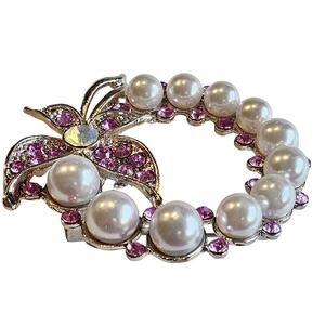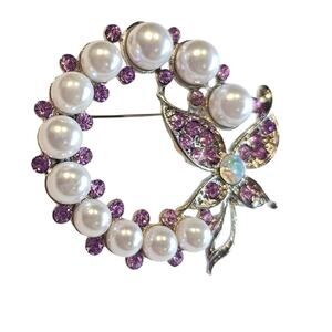 New without tags. Beautiful silver tone brooch featuring faux pearls and purple rhinestones in a circular wreath design with butterfly detail. Measures approx. 45mm (1.8 in). Includes free gift box. Secure pin back.