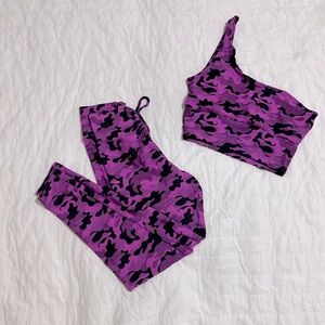 Stylish purple camouflage leggings and crop top set. Perfect for casual wear or workouts.