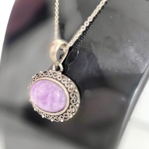 Gently used purple Charoite stone set in a stainless steel decorative setting, measurements are approximately 1.25x1.5", and it comes on a 36" chain.