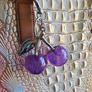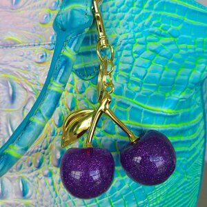 Do you need Purple Cherries Purse Charms with Key Ring? Of course you do! Is your purse unadorned? Do you love cute purple cherries? Then this is the purse charm for you. It's plastic with a metal clasp and key ring. The ring to hold your keys is round. It has gold toned hardware and a spring loaded clasp.