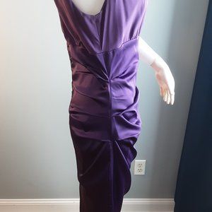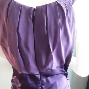 Meticulously Styled and tailored cocktail dress by Suzi CHIN for Maggie boutique. Rich purple color with front and back horizontal pleats to accentuate the fit. Split in the back with back zipper closure. Sleeveless and fully lined. Self is 100% silk. Combo is 68% Acetate, 29% Nylon and 3% spandex. Lining is 100% polyester. Dry Clean Only. Size 10. This garment is gently used and in good condition.