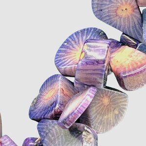 This Purple Coral necklace exudes a vintage charm with its unique coral pieces and a multicolor glass rhinestone cross pendant, creating a distinct and elegant look.