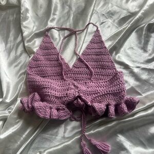 Stylish purple crochet crop top with ruffle hem. Features adjustable straps and tassel details.