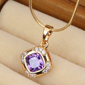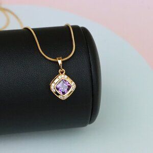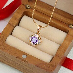 Chic and feminine purple pendant featuring a cushion-cut center stone surrounded by shimmering accents. Crafted from gold-plated high quality brass.