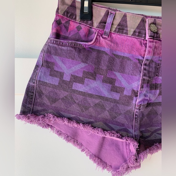 Super fun geometric pattern, purple denim shorts.
