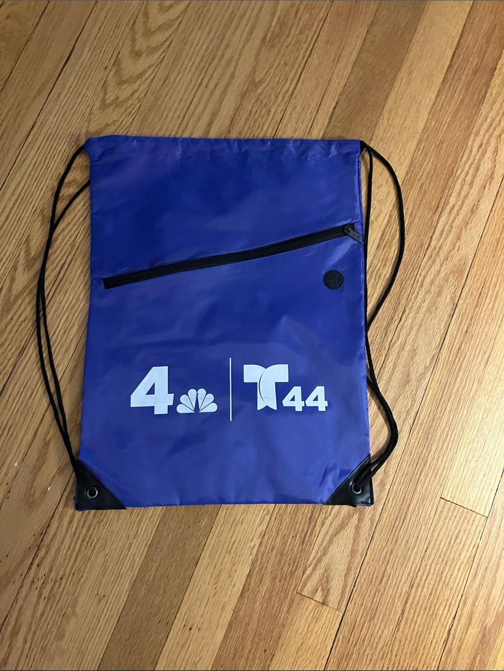 Lightweight blue drawstring backpack with a front zip pocket for quick access. Features NBC and Telemundo 4/44 logo for branded style. Comfortable cord straps and reinforced corners for everyday use. Never used.