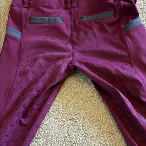 Stylish purple equestrian riding pants with reflective details. Perfect for riding enthusiasts.