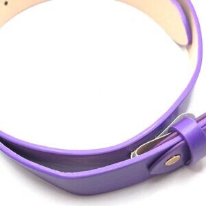 The belt measures 37 inches long overall and 1.25 inches wide. Had a gold tone buckle. Will fit waist size 26 nches to 32 inches. The belt is made of vegan leather-color is purple