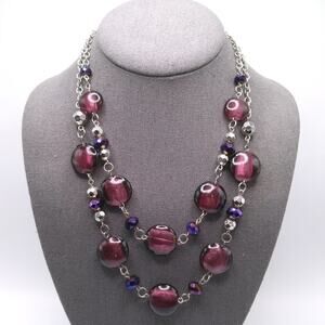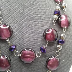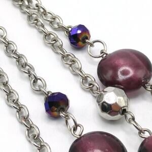*Description: This is a beautiful purple beaded necklace with large flat purple beads and iridescent purple crystal beads on a silver tone chain. The necklace has two strands giving it a layered look. It looks like it has never or rarely been worn. This would be a great addition to your jewelry collection or make a great gift!