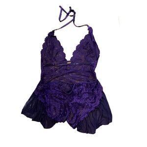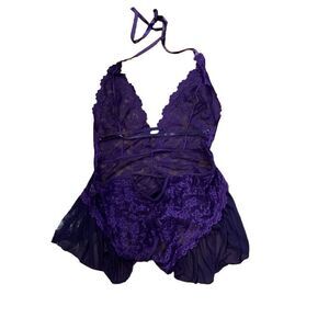 Purple Floral Lace Teddy Lingerie Bodysuit Halter Deep V Neck One Piece Sz 3X