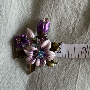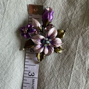 This exquisite brooch features a floral design in shades of purple with rhinestones. Add a touch of sparkle to any outfit.