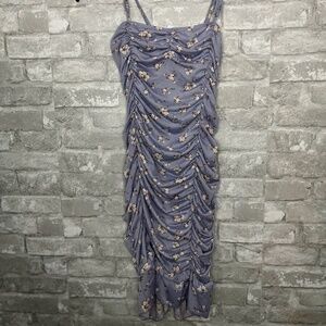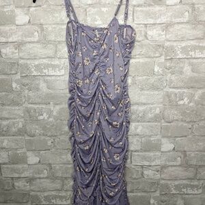 Soft and stretchy mini dress in a muted lavender tone with delicate floral print. Features all-over ruching for a flattering, body-hugging fit and thin adjustable spaghetti straps. Brand new, never worn, in excellent condition.