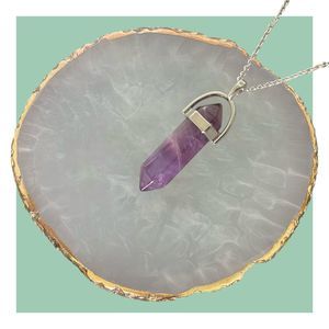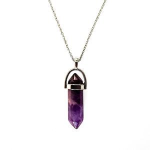 This purple gemstone pendant necklace with silver plated cable chain looks great with any outfit on its own and even better layered with other necklaces for many more fashionable possibilities. This exquisite necklace features a captivating purple gemstone pendant delicately suspended from a silver-plated cable chain, making it the perfect accessory for layering with your favorite necklaces.