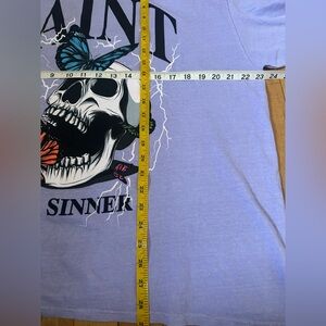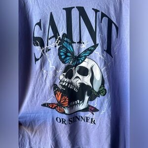 Purple tee featuring a bold skull and butterfly graphic with 'SAINT OR SINNER' text.
