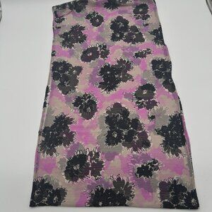 Beautiful lightweight handmade infinity scarf in a soft sheer chiffon-style fabric with a floral watercolor print. Colors include orchid (a pinkish-purple that shifts in lighting), warm gray, black, and a soft warm white that appears almost gray in certain light. Fabric has a subtle crinkle texture—structured but flowy, with a semi-crisp hand. Preowned and previously worn, but in excellent condition with no flaws noted.