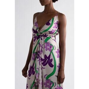 Step into elegance with this satin midi dress, adorned with lush green and purple florals. Featuring a flattering low-cut neckline and a flowy silhouette, this dress moves gracefully, making it perfect for both daytime gatherings and evening events.