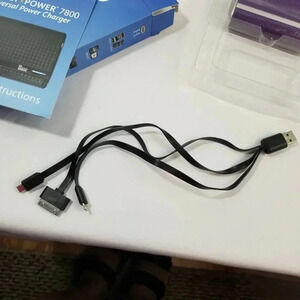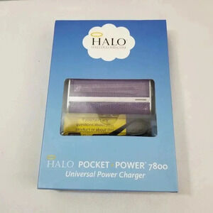Halo pocket power 7800 universal charger includes a 3-in 1 cable in a beautiful purple color. Charger for mobile phones, tablets, cameras, GPS, Gaming, and MP3.