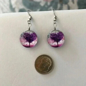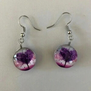 Purple Hearts Glass Tree 3D Drop Earrings NWT