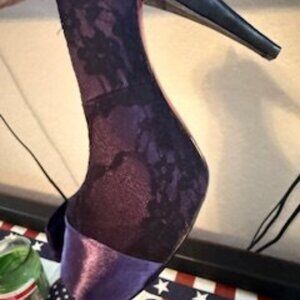 Brand is Paris Hilton. Super cute on. Great condition! These stunning heels feature a sophisticated two-tone design with a striking purple and black color scheme. The high stiletto heel and open toe design make them perfect for formal occasions, while the elegant bow detail adds a touch of glamour.