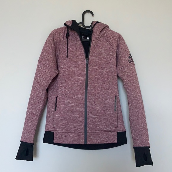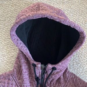 thick material, perfect for workout in cold weather, purple, unique design, many pockets, adjustable hoodie, barely worn, perfect condition, thumb holes