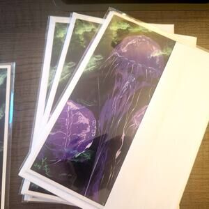 Set of 4 greeting cards depicting my acrylic painting of jellyfish floating in a dark tank. Original was an acrylic painting, now made into quality cards.