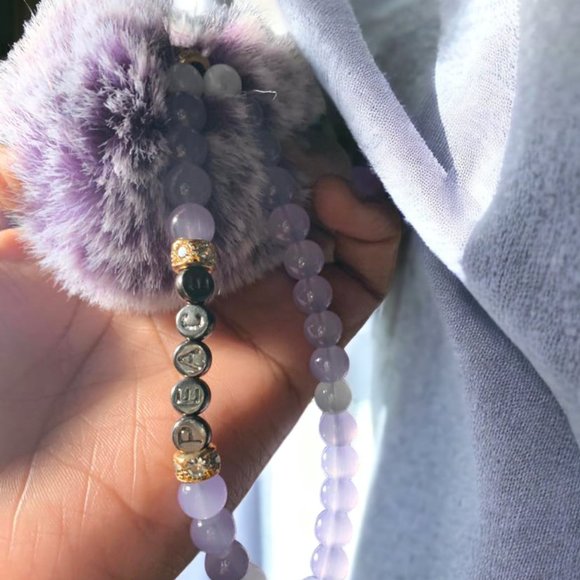 Purple, white, and gold beaded keychain. This have the word peace in a dark sliver/grey bead. With a fluffy purple attachment.