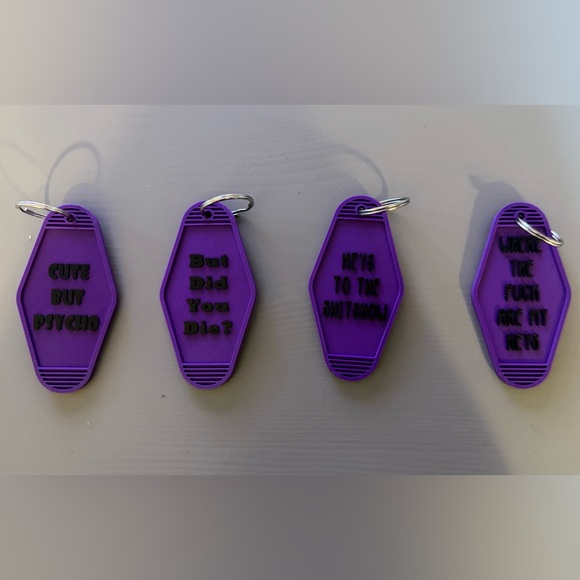 Set of purple keychains featuring humorous text. Perfect for adding a touch of fun to your keys.
