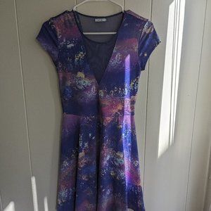 Cute purple and pink allover abstract pattern skater dress with deep V mesh panels in front and rear and cap sleeves, worn once but it doesn't look good on me. The condition is like new, it has hung in the closet since I bought it, no defects noted aside from missing size tag -> I cut out the part of the tag that showed the size but it fits like a S/M. There is a lot of stretch so you'd be good if you're a women's or junior's small or medium in dresses.