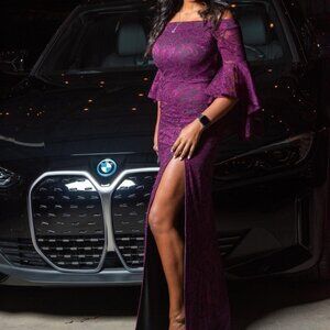 Purple Lace Off Shoulder Ruffle Bell Sleeve Formal Dress Sz XS