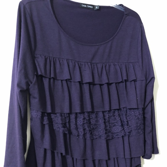 Plumb colored lace ruffled top. Ruffle and lace detail in front, plain in the back. 3/4 sleeves
