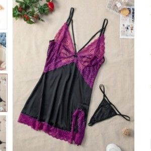 Purple Lace Spice Satin Babydoll with Slit More of a burgundy color Seductive lace with strappy detail Adjustable spaghetti straps Satin skirt splicing with a slit side Delicate lace hemline finished babydoll with matching thong MED Laying flat pit to pit 17.5 inches X-05-8-M SM Laying flat Pit to pit 16.5 inches lc35005-8