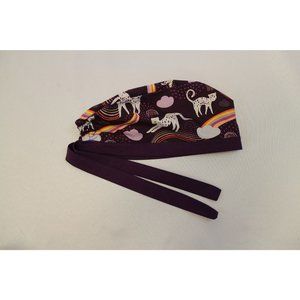 Purple cotton scrub cap. Featuring leopards with purple trim that ties in the back. Washable and reusable, it is eco friendly.