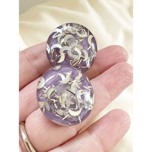 Purple round lucite earrings filled with moon shaped silver confetti.