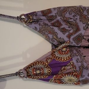 Beautiful print dress in shades of purple with accents in white, red, tan, black, and yellow. Calf-length. Top is double-layered.