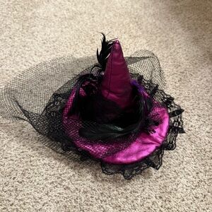 Charming purple mini witch hat adorned with black lace and feathers. Perfect for costumes or themed events. Height is approximately 6”. Width is approximately 6”.