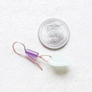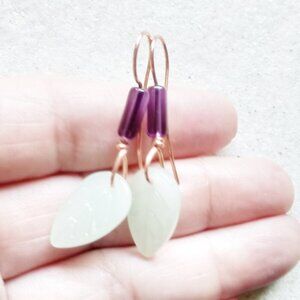 Lightweight, medium length, elegant one piece construction - nothing to lose, come undone or fall off - featuring mint green pressed glass leaves and purple glass rods on a hand shaped and hammered copper earwire. Slip them in and forget you're wearing them.