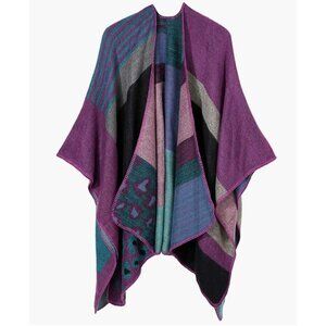 Purple Multicolor Colorblock Print Knit Poncho Shawl Cape Pashmina Wrap Sweater