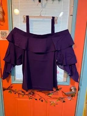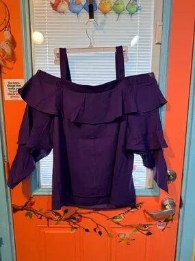 Bold purple off-shoulder blouse with layered ruffle sleeves. Shoulder straps for support. Flowy and feminine silhouette. Great statement piece.