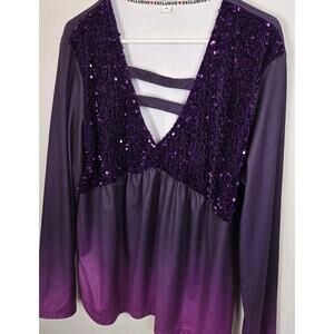 Purple Ombre Glitter V Neck Strap Long Sleeve Top Baby Doll Style Glam Boho XL