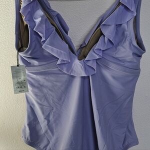 Elegant purple one-piece swimsuit. Ideal for a stylish beach day.