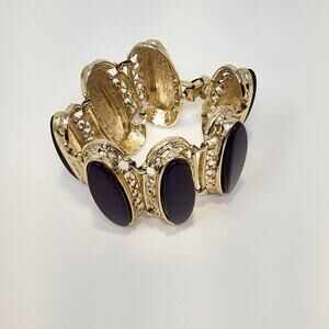 Purple oval and filigree gold tone panel oversized cuff link bracelet, foldover clasp closure. Costume Fashion Jewelry Dramatic Statement Goth Vamp Regency Retro