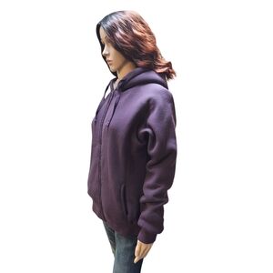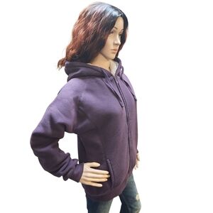 This purple hoodie offers a relaxed fit, perfect for layering during cooler weather. Made from a thick, warm material, it features long sleeves and an attached hood with drawstrings for added comfort.
