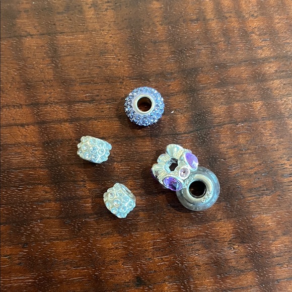Bundle of five beads: one violet crystal pave, one lavender oval Crystal, one purple glass, two silver with clear crystals. Price firm.