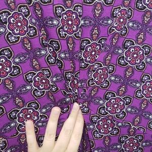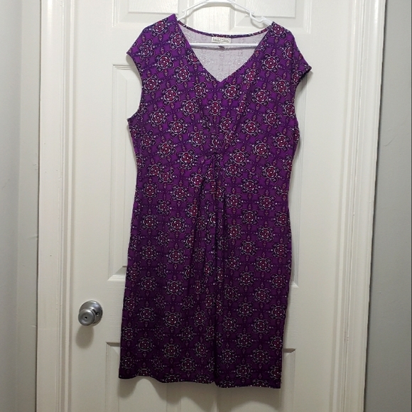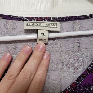 Purple patterned from Dana Buchman. The front gathers under the bust, drapes outward and is very flattering. Not quite sleeveless, but almost. Stretchy, soft fabric, but not sheer. Super comfortable! Hits just above the knee (I'm 5'7"). Worn once.