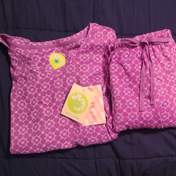 Brand new, never worn (with tags). Butter knit purple pajama set with a stylish pattern. Perfect for lounging. Short sleeves and long pants.
