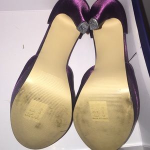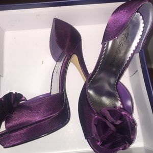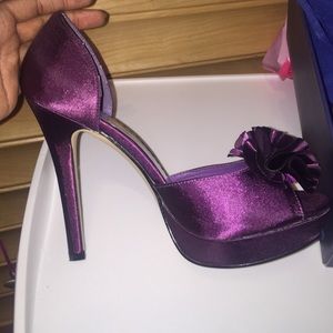 Eggplant purple peep toe pumps. Satin material. Size 7. Runs a little small. 4 3/4 inches tall with 1" platform. Worn once in a wedding. Original packaging included with shoe box, a bag for each shoe and another random bag.